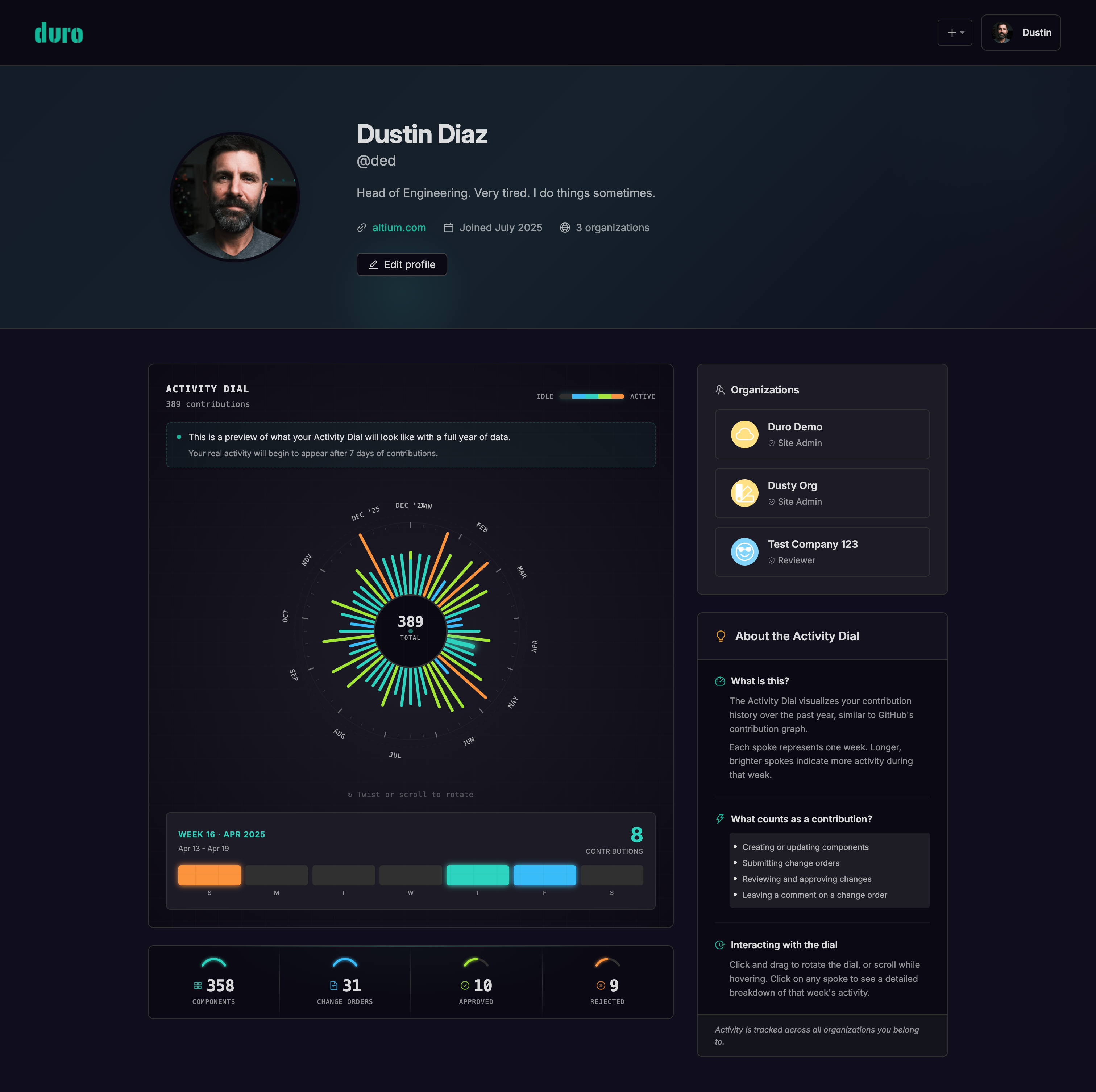 User Profiles at durohub.com/@username establish your professional identity in the hardware engineering community. The centerpiece is the Activity Dial — a radial contribution graph inspired by GitHub's contribution calendar, but with a hardware twist, visualizing your engineering activity over the past year. Each spoke represents a week; longer and brighter spokes indicate more activity. Click any spoke to see exactly what you accomplished.