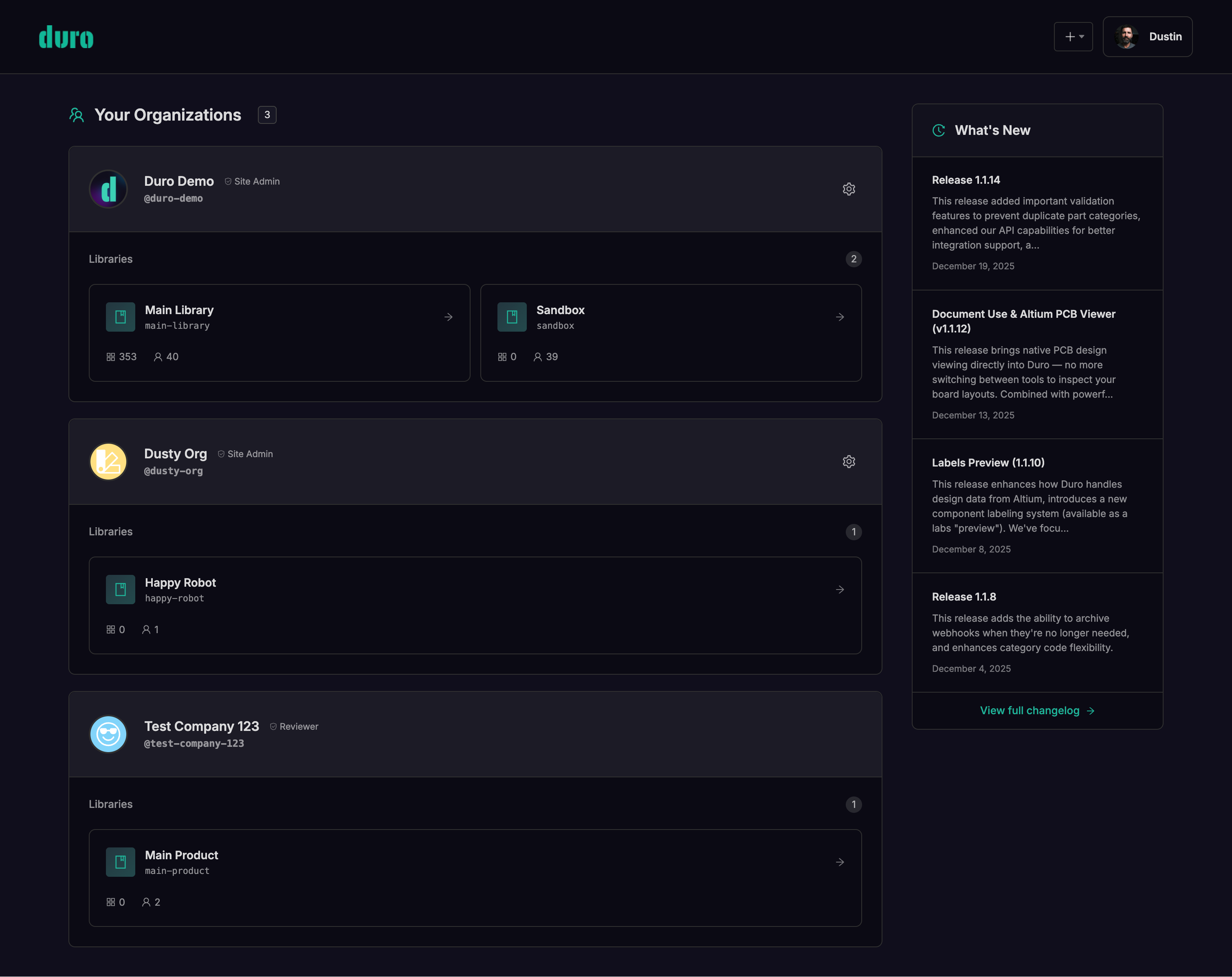 Your Duro identity is now truly yours. Maintain a single account across unlimited organizations, hold different roles in different contexts, and switch between them seamlessly. The redesigned home dashboard provides instant visibility into your entire Duro presence — every organization you belong to, your role in each, and quick-access cards to libraries complete with component counts and team sizes.