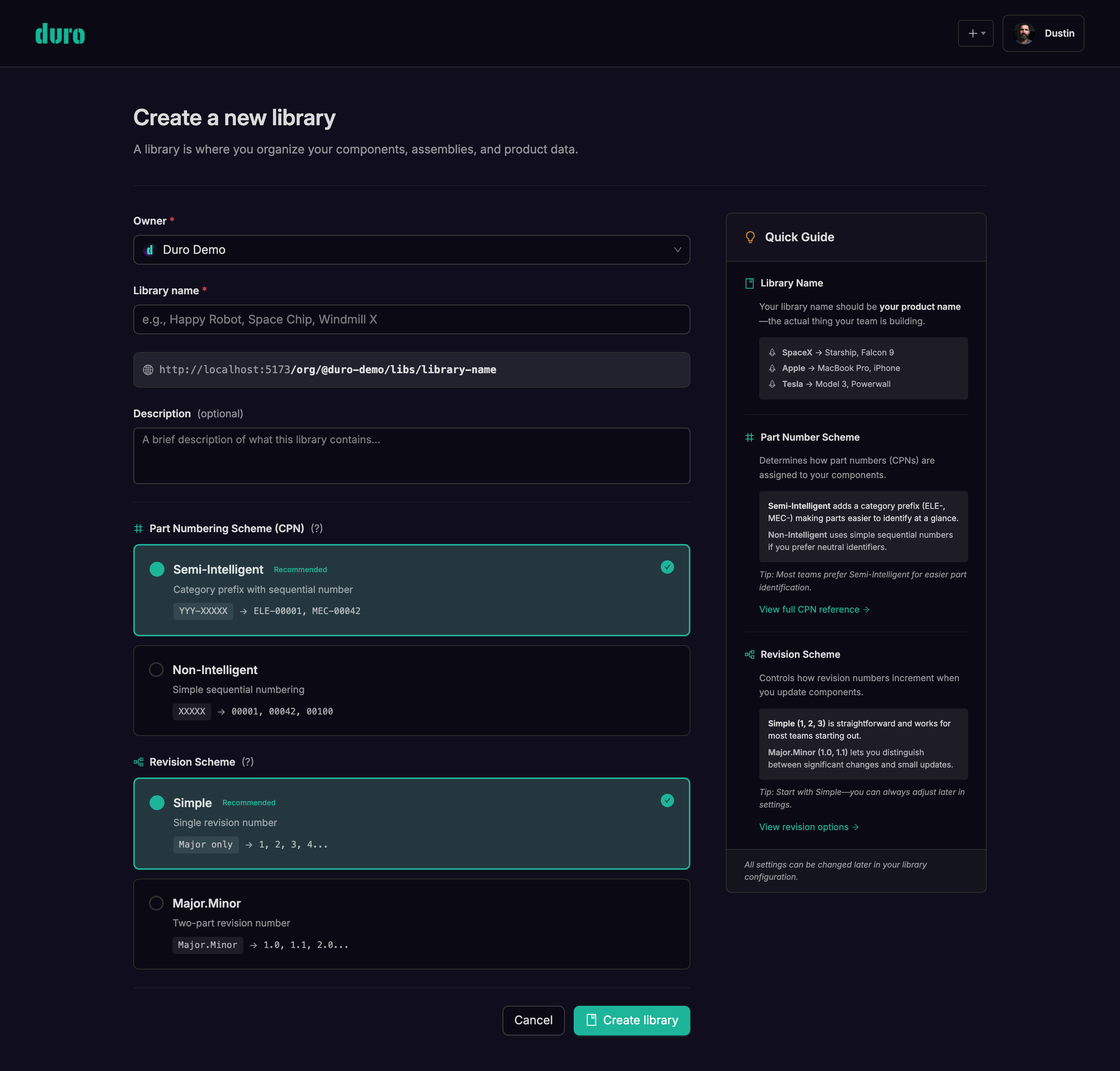 New guided workflows make expanding your footprint effortless. Create organizations with intuitive step-by-step wizards, spin up libraries with intelligent defaults, and configure part numbering schemes and revision strategies during setup — not after.